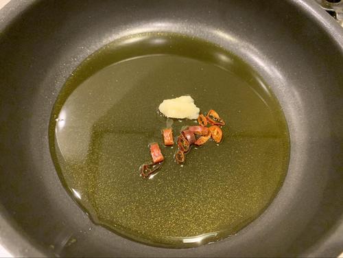 フライパンにオリーブオイル・ニンニク・唐辛子を入れて、中火で熱する。