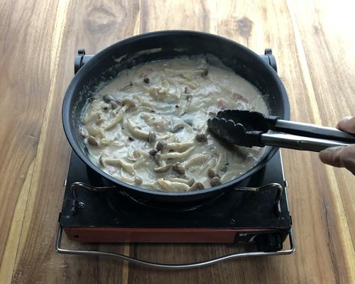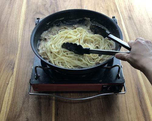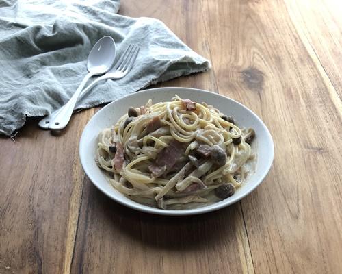 ほどよくとろみがついてきたら火を止め、パスタを入れてソースと絡ませる。塩コショウで味を整える。