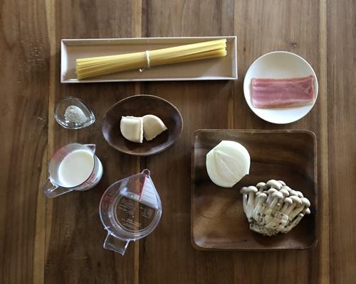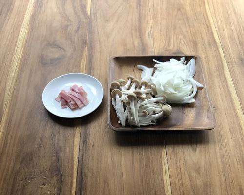 しめじは石づきを除き、小房に分ける。玉ねぎは薄切りにスライスする。ベーコンは1cm幅程度に切る。