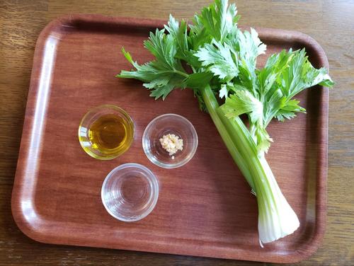 セロリは根元を落として筋を取り、食べやすい大きさに切る。