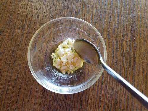 刻んだニンニクと塩を皿に入れ、塩が馴染むまでしっかり混ぜる。オリーブオイルを計量したなかから少々加え、混ぜ合わせる。