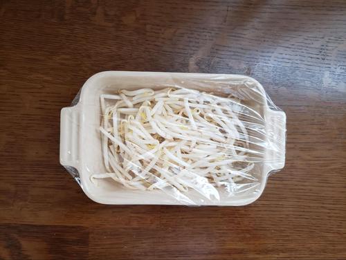 もやしは水洗いして、耐熱皿に入れてラップをする。600Wの電子レンジで3分加熱する。