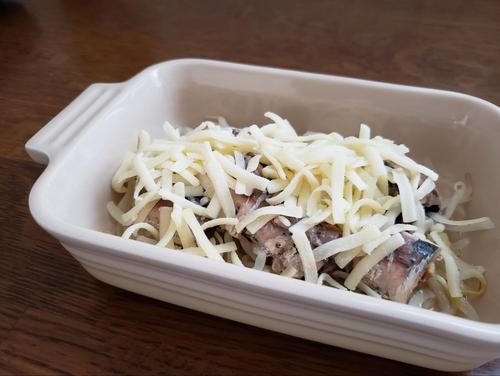 もやしの上に、液汁を除いたイワシをのせてからチーズをかける。