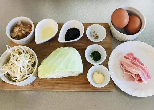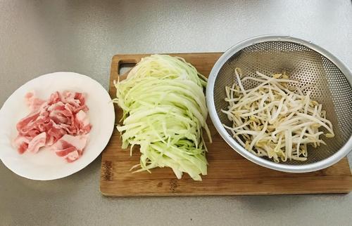 キャベツは千切りに、もやしは洗っておく。豚肉は一口大に切る。
