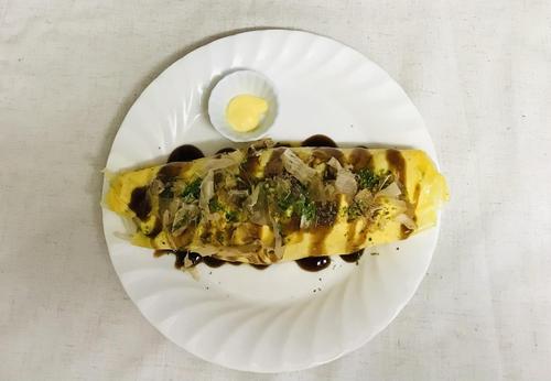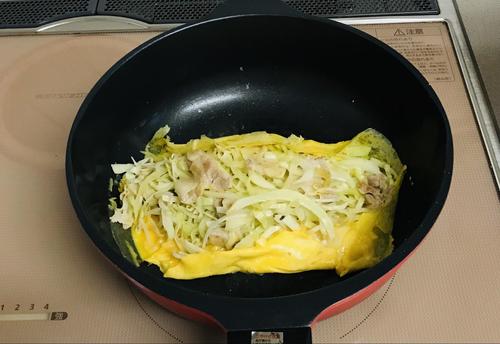 卵をほぐしておく。フライパンに油を熱し、中火で溶き卵を全体に広げる。半熟くらいで火を止め、中央に2をのせる。両端を折りたたみ、お皿に盛る。