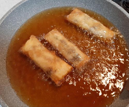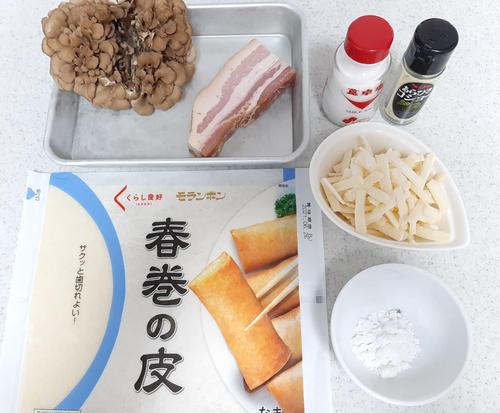 春巻きの皮の上に、粗熱が取れた舞茸・ベーコンとピザ用チーズをのせる。手前から包み、中央まで巻いたら両端をたたむ。巻き終わりに水溶き片栗粉を塗って閉じる。