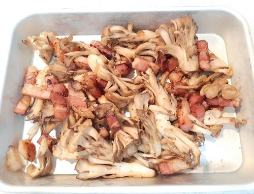 舞茸は石づきを取って、手でひと口サイズにほぐす。ベーコンは細切りにする。フライパンで中火で2分ほど炒める。焼き色がついたらバットに取り出し、粗熱を取る。ベーコンの塩味をみて、必要であれば少し塩・コショウで味をつける。