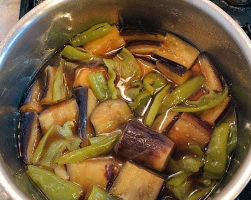 鍋の煮汁の中に、揚げたナスと万願寺とうがらしを入れる。弱火に近い中火で10分程度煮たら完成となる。
