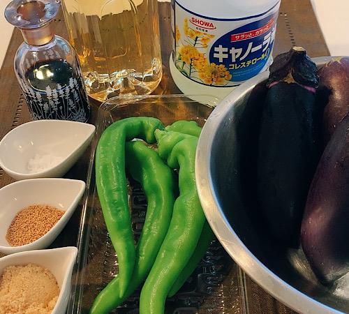 ナスは大きめの乱切りにして、水にさらしてアクを取る。万願寺とうがらしは茎を切り落として、半分に切ってから縦に割り、種を取り除いておく。