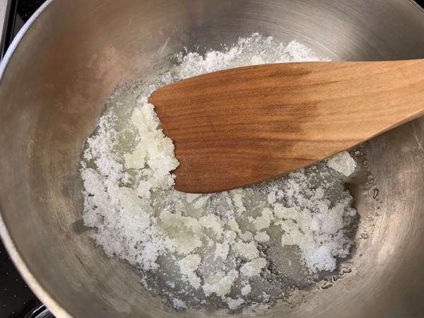 砂糖を鍋に入れ、火にかける。すぐに水大さじ2杯を加えてかき混ぜ続ける。