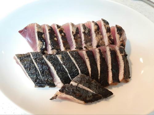 鰹のたたきを1cm幅にカットしてお皿に並べる。