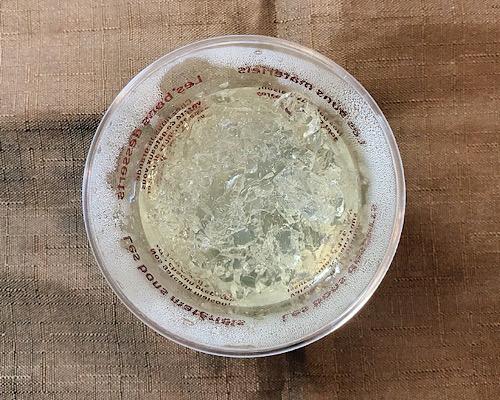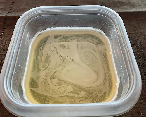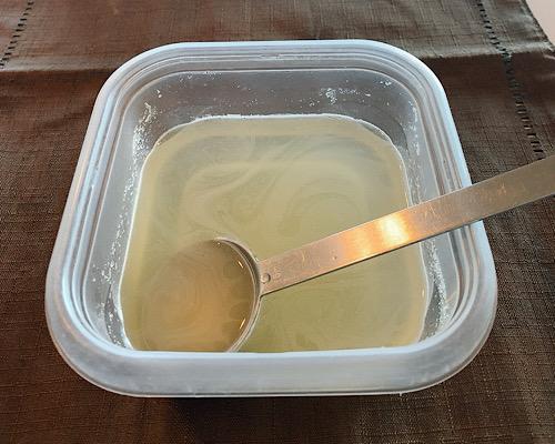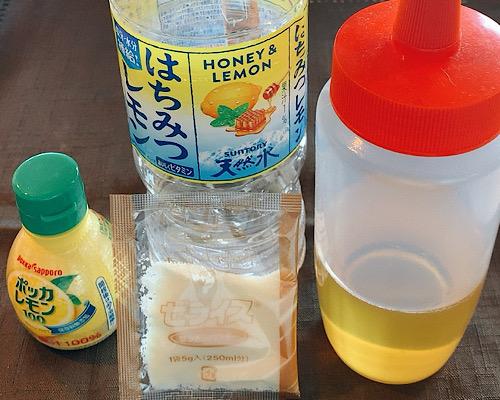 耐熱性のタッパーなどに、天然水、レモン汁、ハチミツ、ゼラチンを入れて、スプーンなどを使い混ぜ合わせておく。