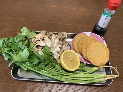 舞茸は手で裂いて、さつま揚げは食べやすい大きさに切る。