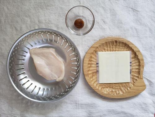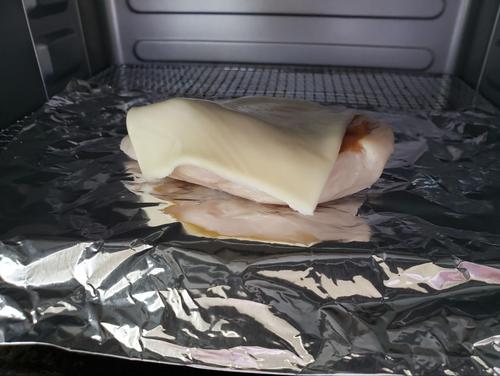 梅肉を塗ったサラダチキンにスライスチーズを乗せ、トースターで10分程度焼く。焦げ目がつくように、しっかり焼いていこう。