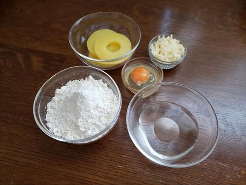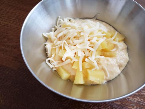ホットケーキミックスに水と溶き卵を加え、しっかり混ぜて生地を作る。生地ができたら、パイナップルとシュレッドチーズを入れてさっくり混ぜ合わせる。