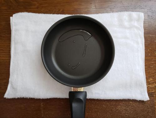 濡れタオルを準備しておく。フライパンにサラダ油を入れて、中火にかける。温まってきたら生地を流す前にフライパンの温度を下げる。濡れタオルにフライパンを置き、水が蒸発する音が消えるまで待つ。