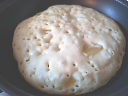 フライパンに生地を流し、中火で3分程度焼く。表面が乾き気泡ができてきたら裏返し、裏面も2?3分程度焼いてしっかり焼き目をつける。