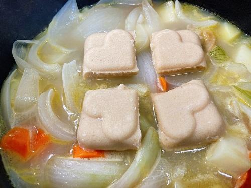 野菜がやわらかくなるまで煮込んだら、ルーを加えて溶かしていく。10分程度煮込んだら火を止めて、豆乳を加えてよく混ぜる。豆乳は分離しやすいので、その後はなるべく煮立たせない。最後に醤油を加えて味を調える。