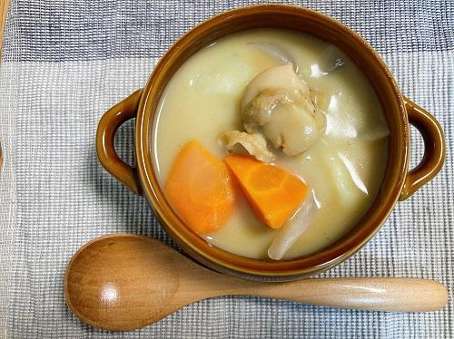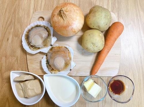 じゃがいもは一口大、にんじんは乱切り、玉ねぎはくし切りに。ホタテは殻から外しておく。大きめの鍋にバターを入れ、火にかける。野菜とホタテを入れて焦げないようによく炒める。