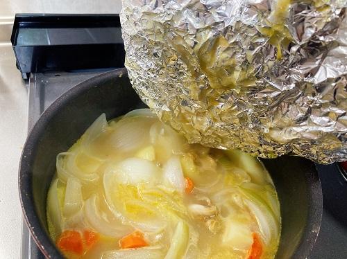 炒めたら、すべての具材が被る程度の水を入れ(ルーの外箱に記入されている分量分が好ましい)、中弱火で15分ほど煮込む。アルミホイルを一度くしゃくしゃにしてから落しぶた代わりに入れておくと、外すときにあくも一緒に取れるのでおすすめだ。