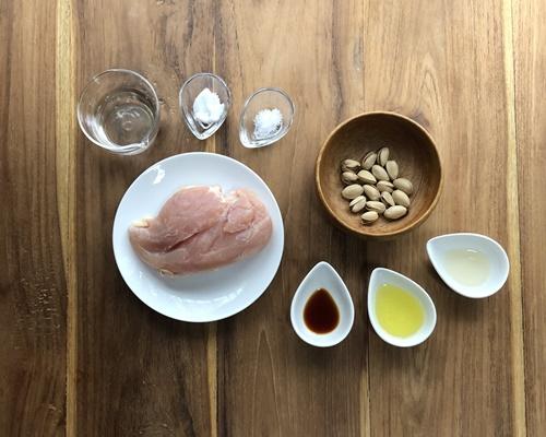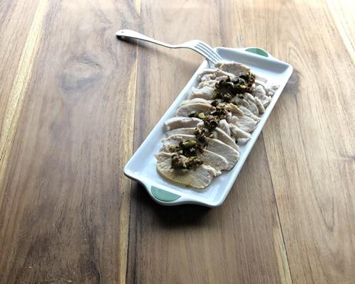 鶏むね肉を食べやすい大きさにスライスし、ピスタチオソースをかけていただく。