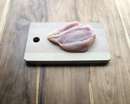 鶏むね肉は厚さが均一になるように包丁を入れて開く。フォークを使い、両面に数か所穴を開ける。砂糖、塩を両面にふり、よく塗りこむ。