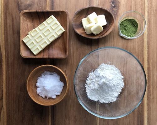 薄力粉、砂糖、抹茶パウダーをボウルに入れて混ぜ合わせる。別の耐熱容器にホワイトチョコ40g(分量の2/3)とバターを入れて、600Wの電子レンジで1分加熱し、よく溶かし合わせる。