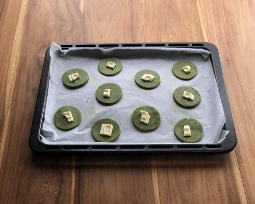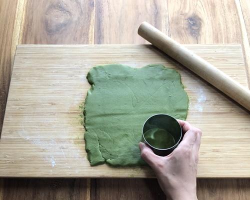 まな板に薄力粉(分量外)をまぶし、生地を薄く伸ばして型抜きする。または、手で丸めて平たく整えてもよい。残りのホワイトチョコを小さく割り、トッピングする。
