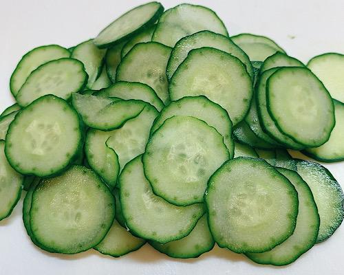 ワカメはぬるま湯に浸けて戻してから、水切りをしておく。キュウリは端を落とし、薄めの輪切りにする。