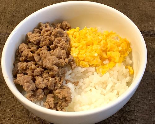 大きめのおわんに、ごはんを盛る。ごはんの表面の1/2に肉そぼろ、1/4に卵そぼろ、1/4に鮭フレークをのせたら完成となる。