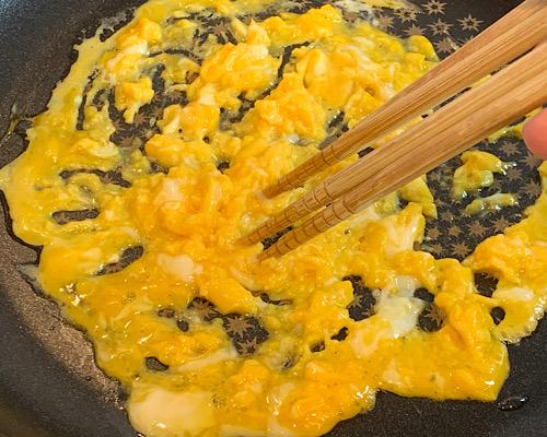 ボウルに卵を割りほぐし、砂糖を加えて混ぜ合わせる。フライパンにサラダ油をひいて卵を流し入れ、菜箸でクルクル混ぜて、スクランブルエッグにする。この時に菜箸を2膳使うと、より混ぜやすくなるので、試してみてもらいたい。