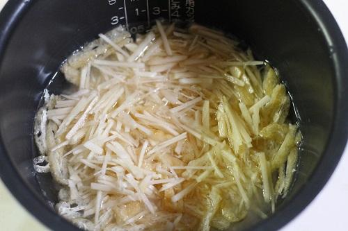 炊飯器に、米、白だしを入れ、2合の目盛りまで水を入れてひと混ぜする。そこに新ショウガ、油揚げをのせて炊く。