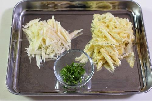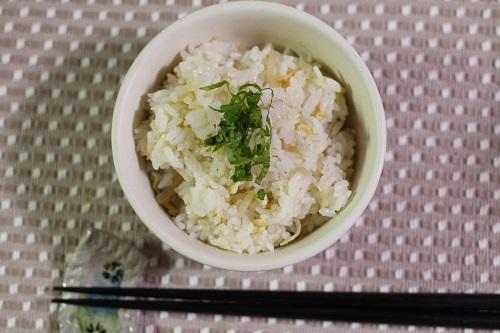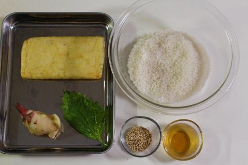 米は研いで30分程浸水させる。新ショウガは皮をこそげ落とし、3~4cmの細かいせん切りにする。油揚げ、大葉も同様にせん切りにする。