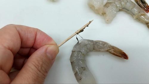 エビは尻尾を残して殻をむく。背ワタは、つまようじを使って取る。背中側の半分より少し下あたりに突き刺して上に持ち上げると、自然に背ワタがついてくる。背ワタを取ったら再度水でよく洗い、水気をふき取っておく。