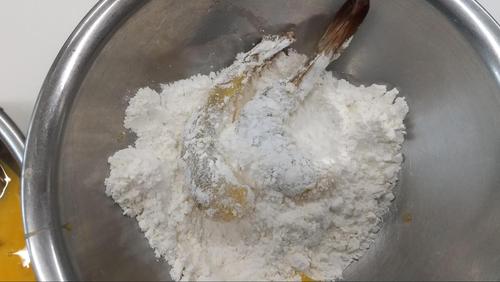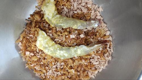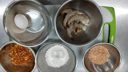 フライドオニオンと大豆たんぱくをあらかじめ混ぜておく。ボウルに卵を割り入れ、よく溶いておく。下処理をしたエビに①小麦粉②卵の衣を付ける。