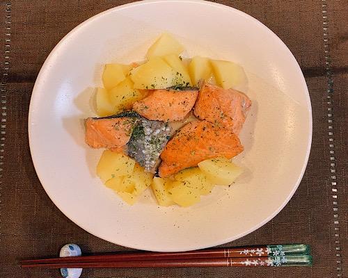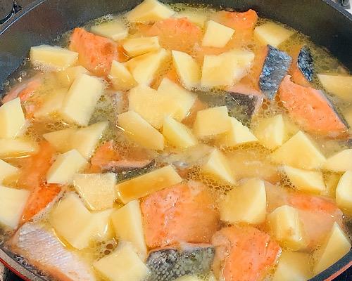 じゃがいもを加えて、全体的に半分くらいまで浸る程度の水を入れて煮る。沸騰してきたら、醤油を加えていく。鮭に火が通り、じゃがいもが柔らかくなったら、味をみて塩コショウで調整する。