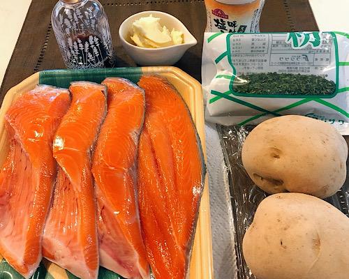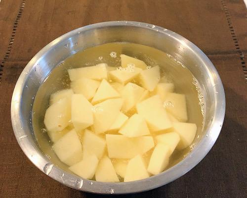 鮭に下味を付けている間に、じゃがいもの皮をむいて一口大に切り、水にさらしてアク抜きをしておく。