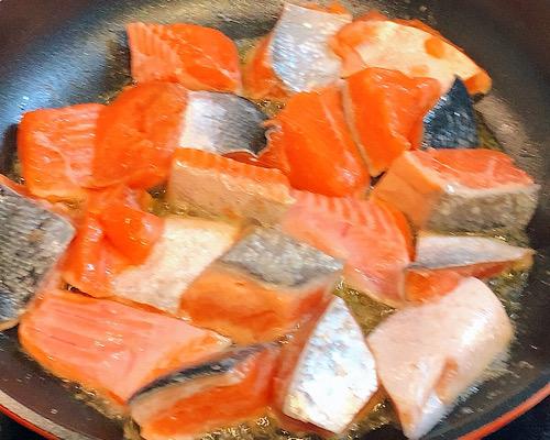 鮭を大きめの一口大に切り、塩コショウで下味を付けておく。焼く10分前くらいから下味を付けるとよいだろう。