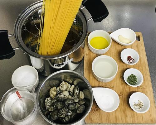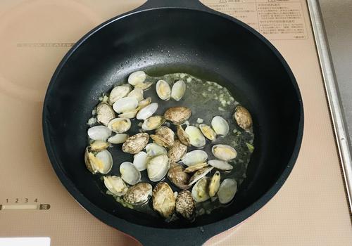 フライパンにオリーブオイル、みじん切りにしたにんにく、輪切りにした鷹の爪を入れ弱火にかけて香りを出す。香りがしてきたら強火にし、あさり、酒を加え蓋をして蒸す。あさりが開いてきたら蓋を外し、一度取り出す。一度取り出すことであさりが硬くならず、ふっくらと仕上がる。