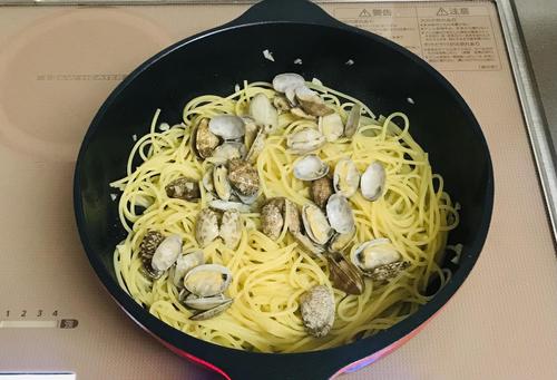 あさりの汁が残ったフライパンに茹であがったパスタを加える。中火にし、パサつくようであればパスタの茹で汁を大さじ1~加え、乳化させる。あさりを戻し、塩、黒こしょうをする。
