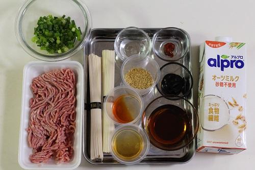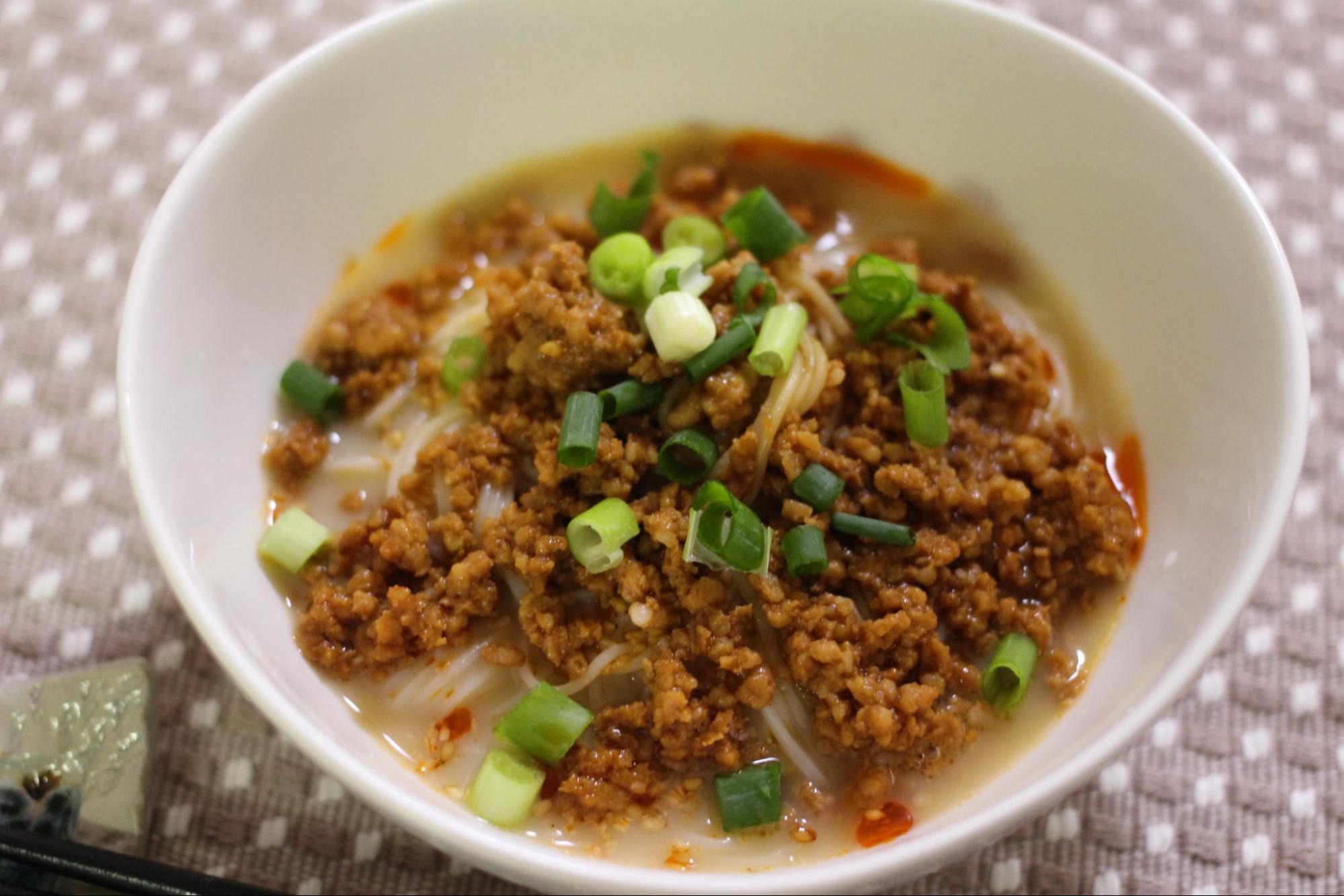 そうめんは表示時間通りに茹で、流水でよく洗い、水気を切っておく。器に茹でたそうめんを盛り、スープを注ぐ。そこに肉味噌、小ねぎを散らして完成となる。