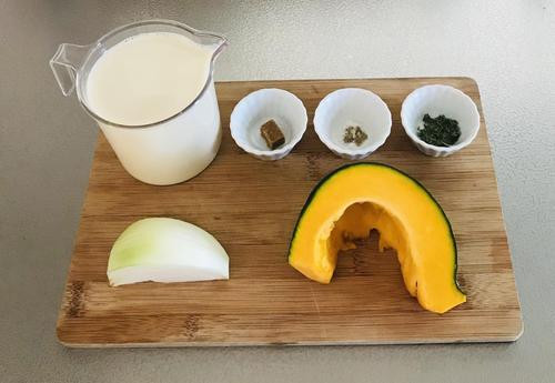 かぼちゃと玉ねぎを耐熱容器に入れて、600Wの電子レンジで5分加熱する。加熱が終わったらコンソメを加え、再び600Wの電子レンジで3分ほど柔らかくなるまで加熱する。