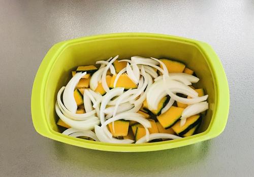 Step.1 かぼちゃと玉ねぎを切り、電子レンジで加熱する