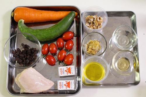 STEP1の食材とレーズン、くるみをドレッシングで和えよう。
