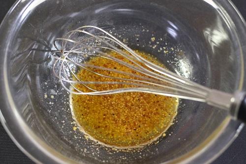 ボウルにすし酢、粒マスタード、はちみつ、オリーブオイル、塩・こしょうを入れて、よく混ぜ合わせる。