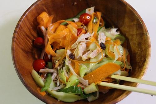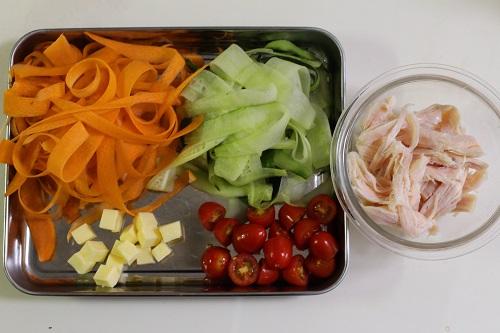 サラダチキンは食べやすい大きさにほぐす。にんじんは端を落として皮をむき、きゅうりも端を落としておく。にんじん、きゅうりはピーラーでリボン状に薄くむく。ピーラーでむけきれない場合は、包丁で薄く切る。プチトマトはヘタを取って半分に切り、プロセスチーズは1個を6等分にする。