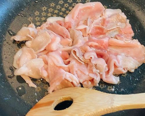 フライパンにサラダ油をひいて、豚肉を炒める。今回は豚バラ肉を用いたが、カロリーが気になるようであればロース肉でもよいだろう。