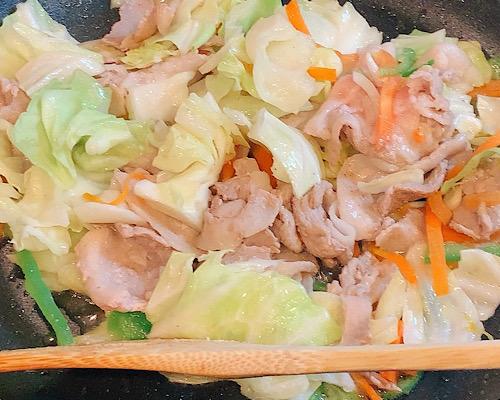 豚肉に火が通ってきたら、もやし以外の野菜類を加える。さらに、鶏ガラスープの素とオイスターソースも入れて、味付けをする。
