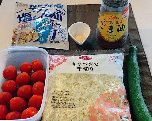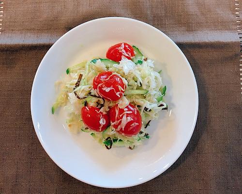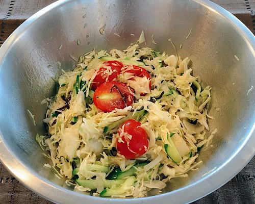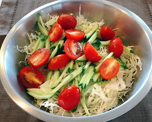 大きめのボウルを使い、キャベツ、キュウリ、ミニトマトを合わせる。