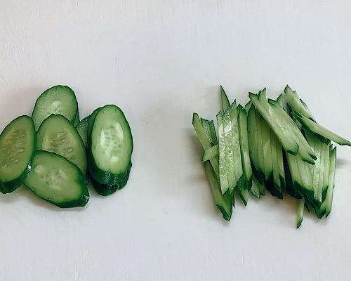 キュウリは端を落とし、斜めに薄切りにしてから、細切りにしておく。ミニトマトはヘタを取り、キュウリの大きさに合わせて、半分か1/4に切っておくとよいだろう。